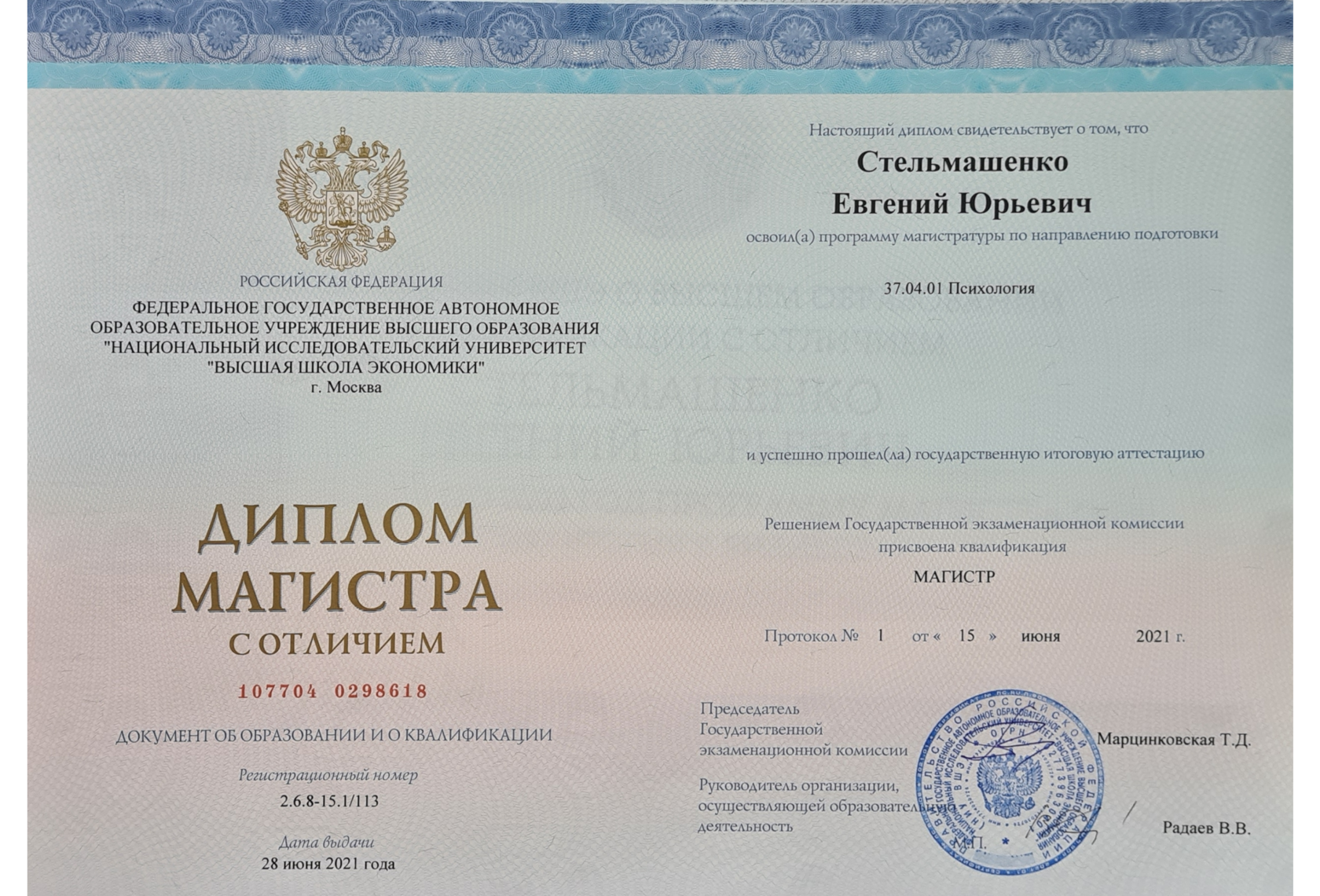 В 2021 году с отличием окончил факультет Психологии "НИИ "ВШЭ" п программе "Психология в бизнесе", разработал методику определения и ранжирования ценностей - "ЦЕННЫЙ КВАДРАТ", Провожу корпоративные тренинги и преподаю в ВУЗах.